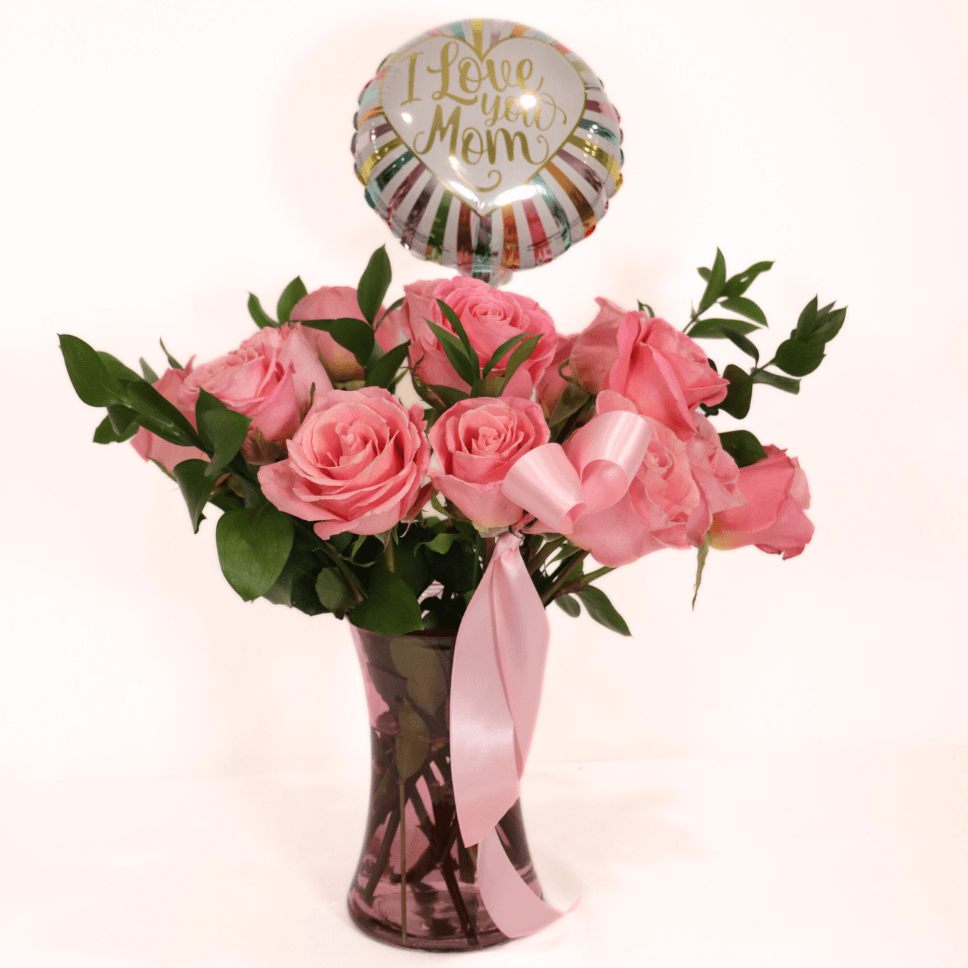Delicate, graceful, and filled with love—just like Mom. This elegant glass vase holds a stunning dozen of premium pink roses, freshly arranged and tied with a satin pink ribbon. A heartfelt “I Love You Mom” balloon adds the perfect touch for Mother’s Day.