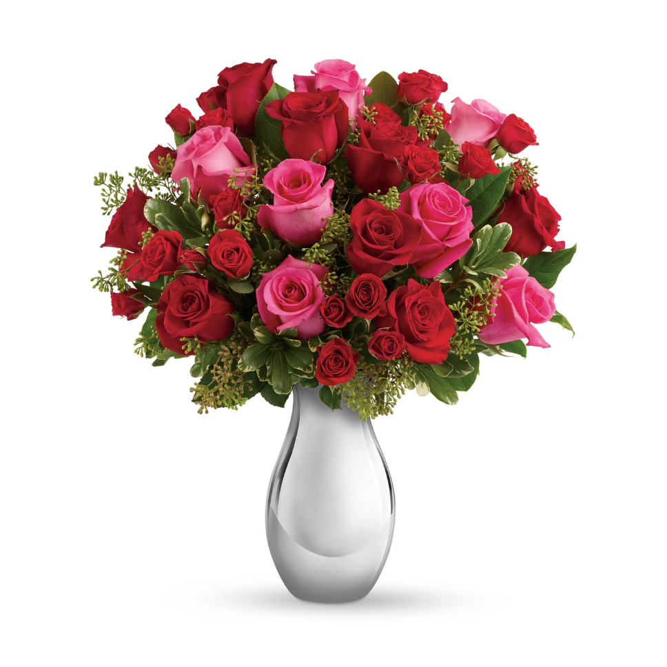 Sweep them off their feet with the Love in Bloom Luxury Rose Bouquet, a breathtaking arrangement of passionate red roses, soft pink roses, and charming spray roses. This lush bouquet radiates romance and admiration, elegantly arranged in a sleek silver vase for a sophisticated touch.